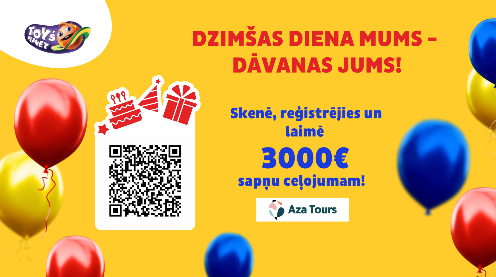 Toy’s Planet dzimšanas diena ir sākusies! Ieskaties, kādu pārsteigumu esam sagatavojuši! skenē, reģistrējies un laimē 3000 eur savam sapņu ceļojumam no AZA TOURS!