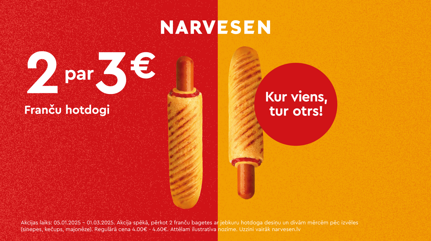 Akcijas laiks: 05.01.2025. – 01.03.2025. Akcija spēkā, pērkot 2 franču bagetes ar jebkuru hotdoga desiņu un divām mērcēm pēc izvēles (sinepes, kečups, majonēze).