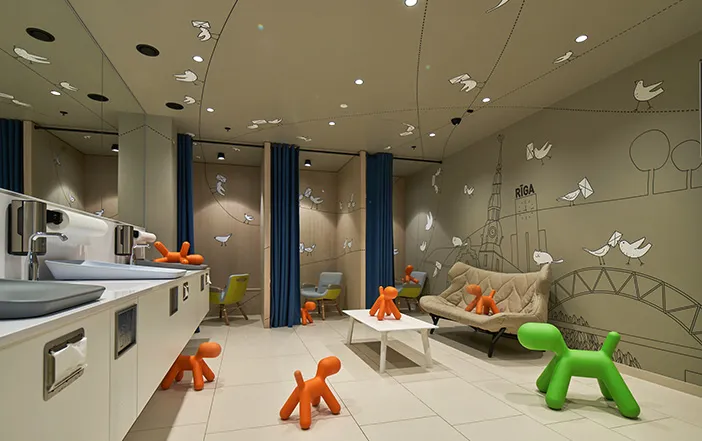 Šīs telpas ir piemērotas tualetes apmeklējumam vecākiem kopā ar pirmsskolas bērniem un telpā var iebraukt ar bērnu ratiņiem. Šeit ir iespēja īpaši pielāgotā un patīkamā vidē pabarot un pārtīt mazuli. Telpā ir pieejams aprīkojums bērnu ēdiena un barošanas pudelīšu uzsildīšanai. Mazāki bērni var rotaļāties vecāku uzraudzībā. Šīs istabas izmantošana ir bez maksas.