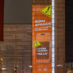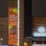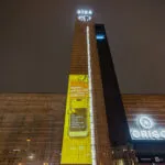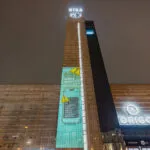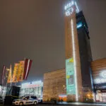 Īpašs gaismas objekts uz Stacijas pulksteņa torņa pie tirdzniecības centra “Origo”
