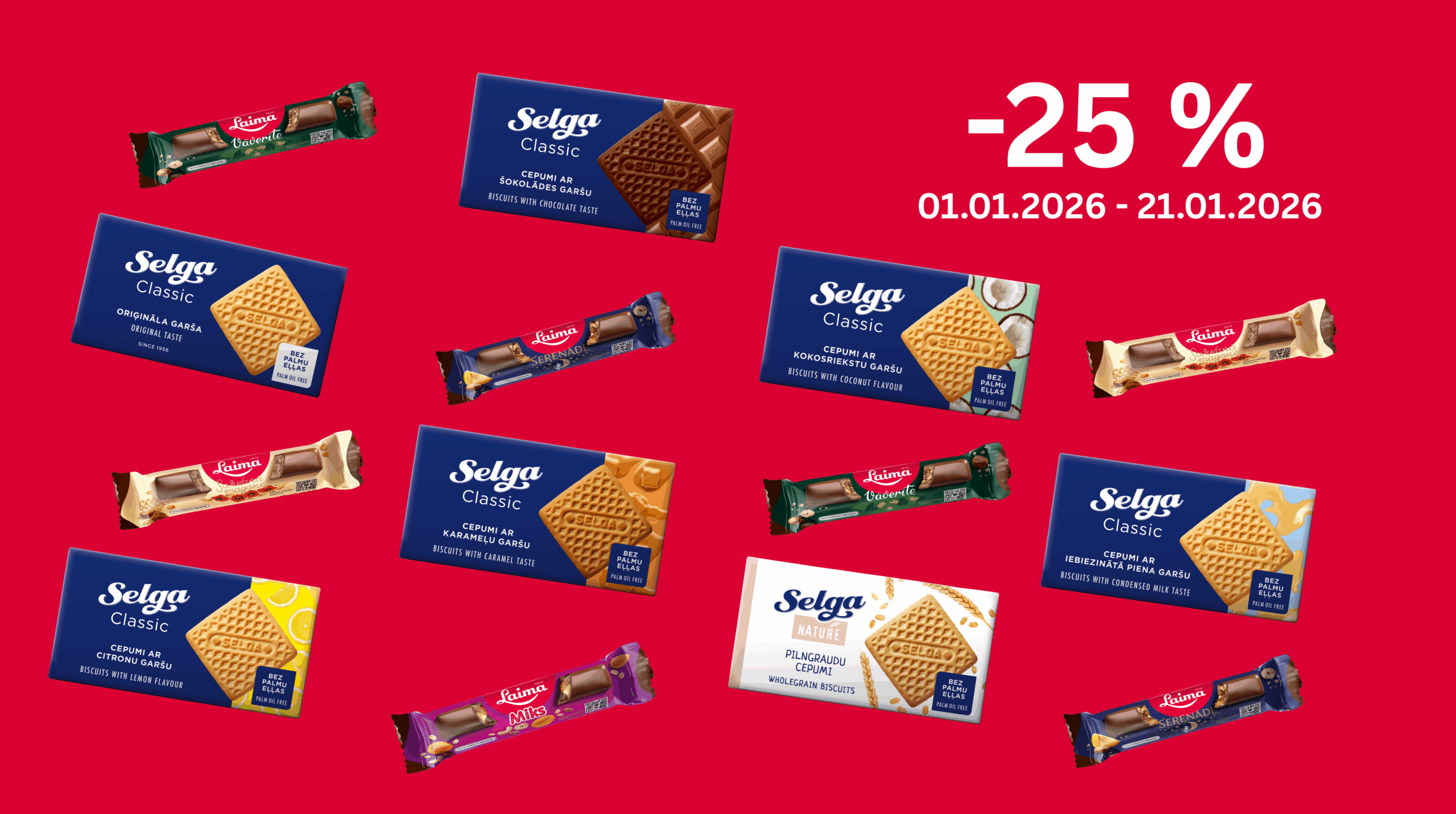В январе в магазинах сладостей Laima действует скидка 25% на печенье Selga и батончики LAIMA.