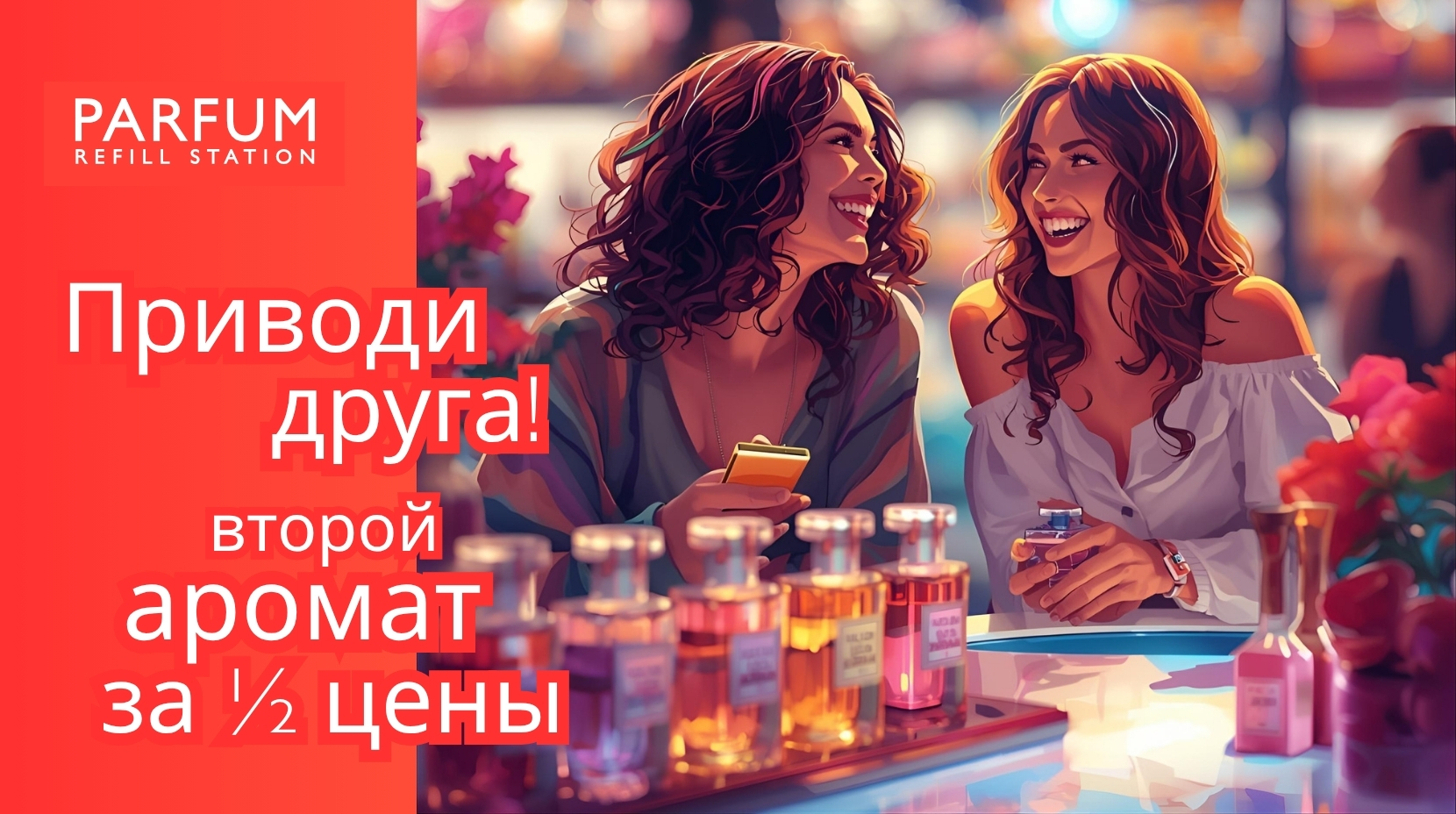 Pērc flakonu ar parfīmu, saņem otro par puscenu. Atlaide attiecas uz lētāko flakonu.