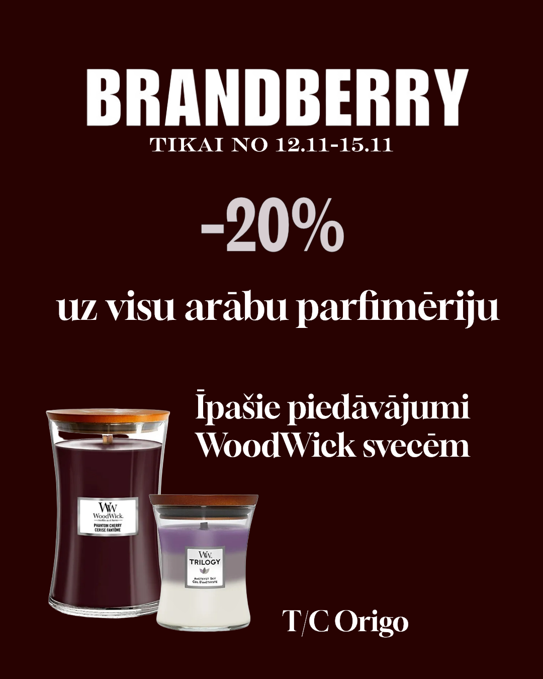 20% atlaide arābu nišas parfimērijai, speciāls piedāvājums WoodWick svecēm: S izmērs – 12 euro, M izmērs – 25 euro, L un XL izmērs – 33 euro