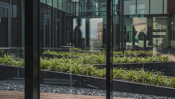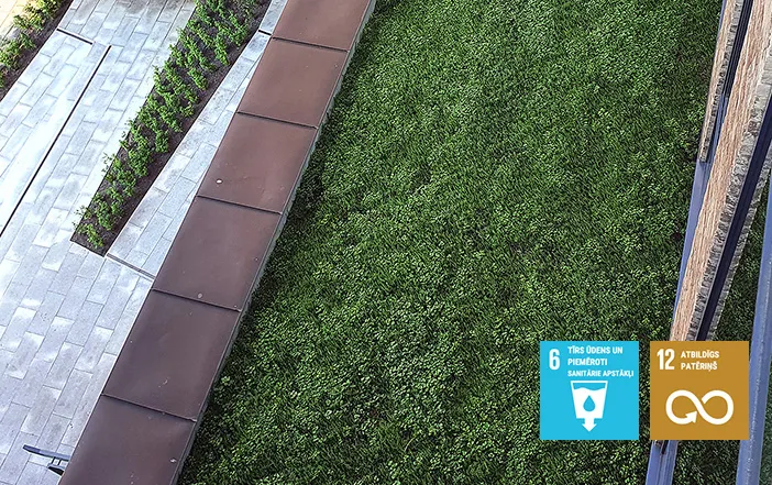 Origo ir izveidoti dažādi risinājumi ūdens taupīšanai, lietus notekūdeņu mazināšanai un lietus ūdens infiltrācijai ēkas iekšpagalmu terasēs un zaļajos jumtos. Augu sugas zaļajos jumtos un puķupodos uz ielas izvēlētas tādas, kas atbilst Latvijas klimatam. Zaļajiem jumtiem papildu laistīšana nav nepieciešama vispār, bet puķupodiem nepieciešama tikai minimāla papildu laistīšana Terases un zaļie jumti tiek apūdeņoti ar lietusūdeni, kas attiecīgi mazina notekūdeņu nokļūšanu pilsētas lietusūdens kanalizācijā. Lai mazāk tērētu ūdens resursus, ja īpaši nepieciešams, dobes tiek laistītas manuāli, netiek izmantota smidzinātāju sistēma.